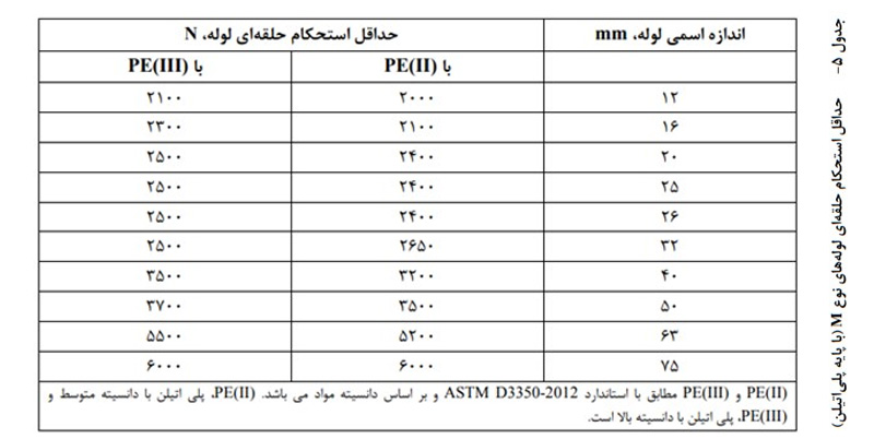 حداقل استحکام حلقهای، باید مطابق جدول زیر باشد.